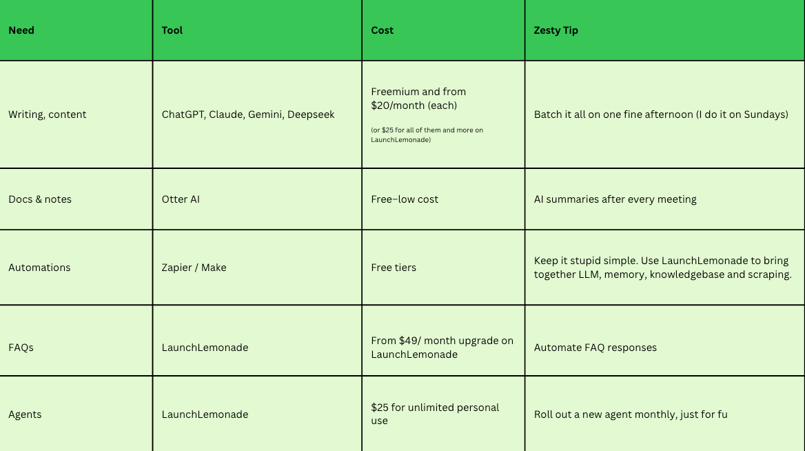 Right, enough pep talk. Here’s how we actually use AI to run a lean, mean, “wait, how are they doing that?” business, without burning cash or sanity.