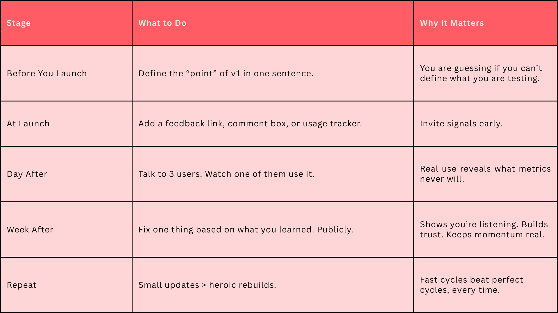You probably overbuilt it if your MVP doesn’t make you wince a little. The point of shipping fast is to learn fast and cheap. And that means putting something in the wild before it’s “ready,” because the only real way to make it ready… is by watching what actually happens when humans touch it.