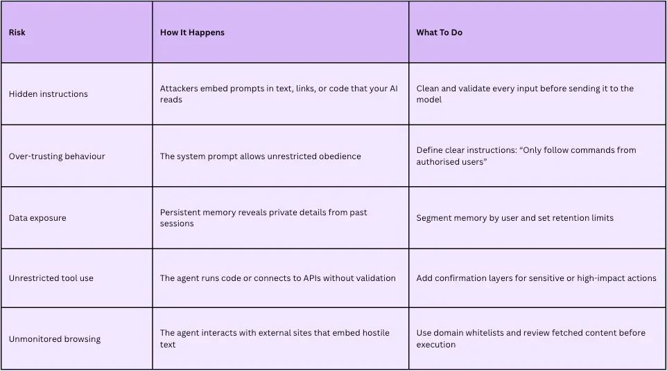As agents become more capable, they also become more persuadable. A single clever prompt can redirect an entire chain of tasks. One disguised instruction can change the intent of your workflow or expose private data.